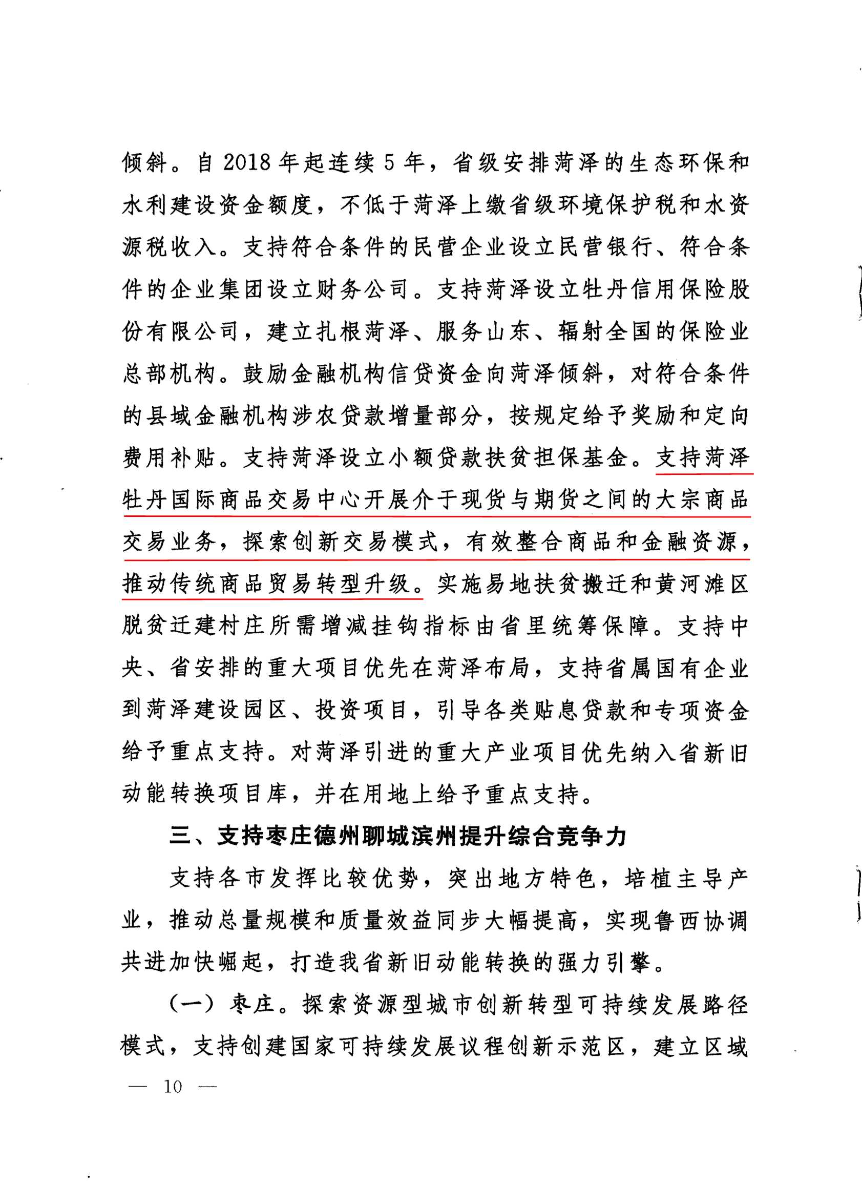 山東省委、山東省人民政府支持牡丹國際商品交易中心開展介于現(xiàn)貨與期貨之間的大宗商品交易業(yè)務(wù)